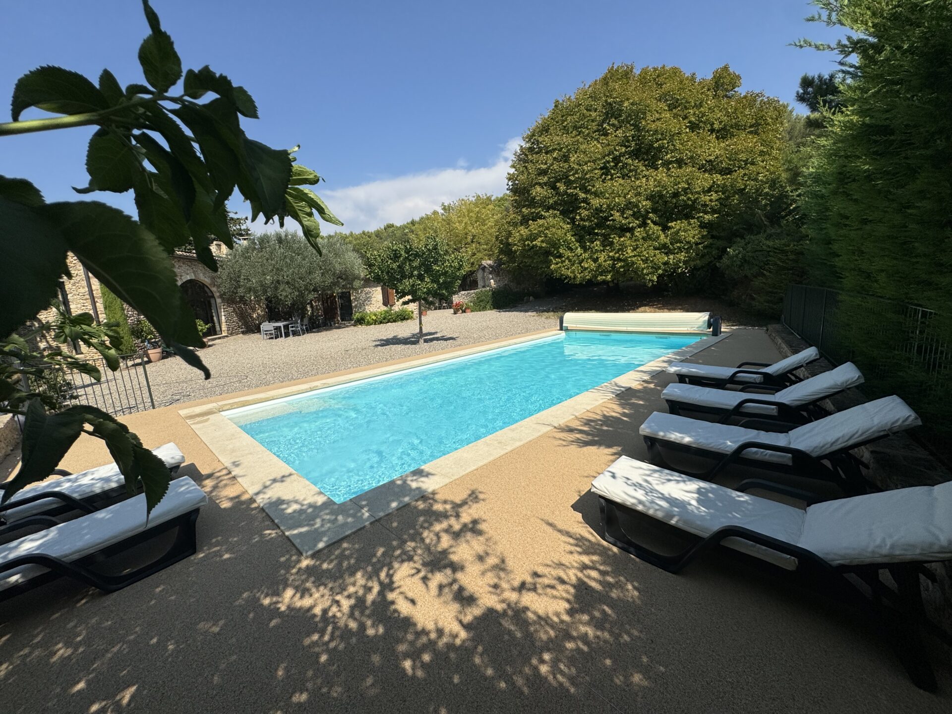 Piscine de 12X5 m chauffée de juin à septembre, traitement cuivre-argent-ozone sans produits chlorés. Non surveillée mais sécurisée par un rideau motorisé. Bains de soleil et ombrage naturel sont à votre disposition.